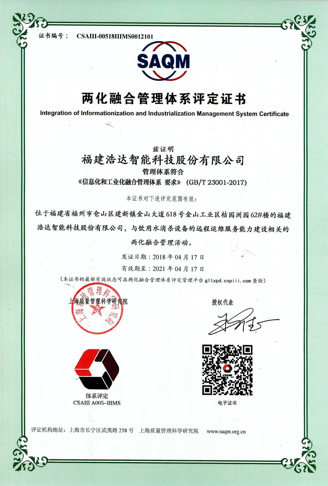 Informatization and industrialization are integrated, and informationization promotes the healthy and orderly development of industrialization as an important task for enterprises. FUJIAN HADA INTELLIGENCE TECHNOLOGY CO.,LTD successfully obtained the "Two-in-one Fusion Management System Evaluation Certificate" on April 17, 2018. This qualification will help promote our technological innovation, enhance industry competitiveness, and promote HADA informationization and industrialization. The deep integration process has provided strong support for our company in the future on Internet +, policy innovation and other projects.